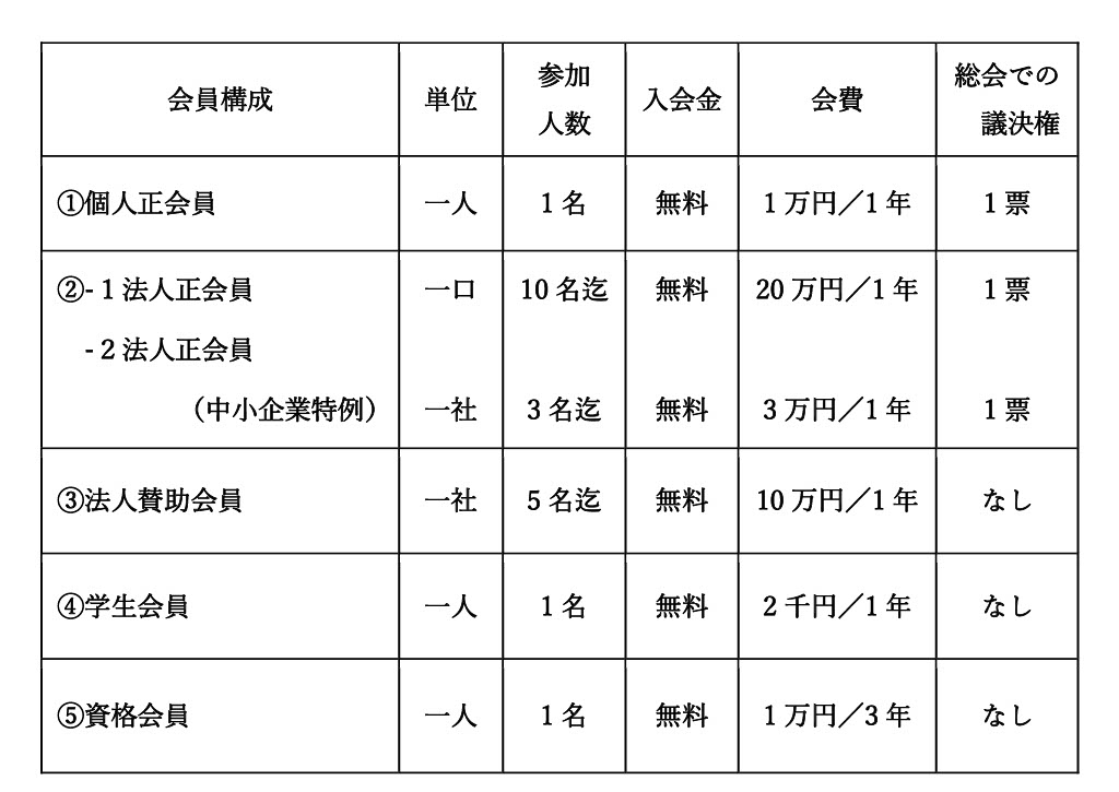 (2)-1 法人正会員:この法人の目的に賛同して入会し、この法人の事業を実施する意思を有する法人及び同法人を構成員とする団体又は組織。年会費20万円/1年